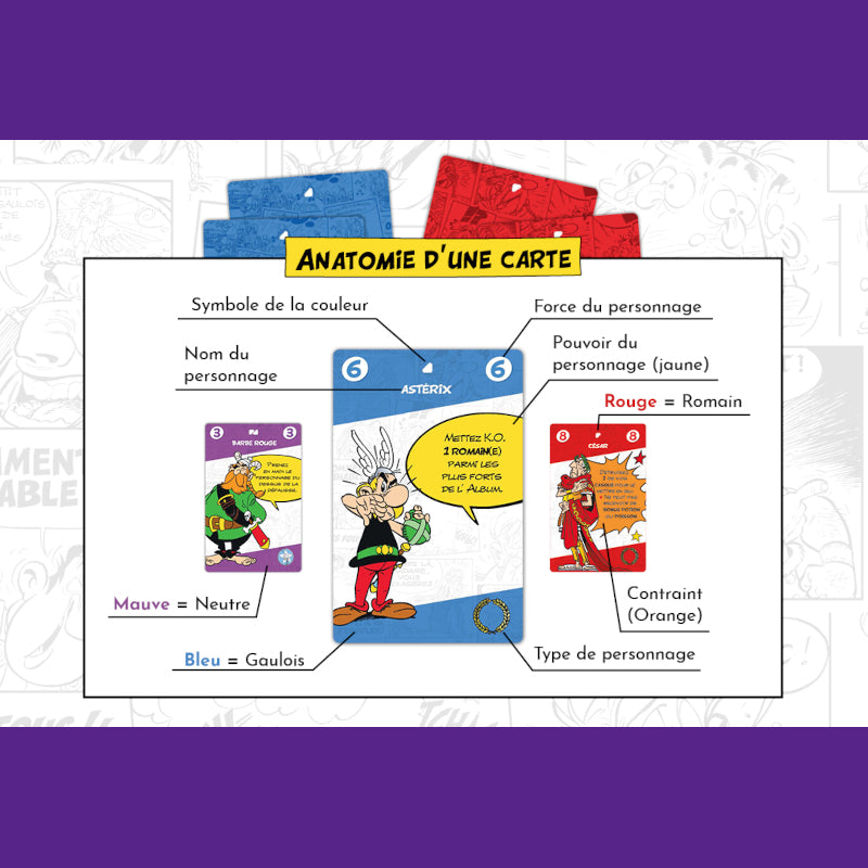 À chaque manche, des cartes albums emblématiques d’Astérix sont en jeu : l’un est tourné côté gaulois, l’autre côté romain. Chaque joueur doit donc soutenir une faction et affronter l’autre. Pour l’emporter, vous déployez vos cartes personnages (gaulois, romains ou neutres), chacune avec sa valeur de combat et ses pouvoirs uniques. Les choix sont cruciaux : attaquer, se défausser pour renouveler sa main, ou jouer un effet spécial au moment opportun.