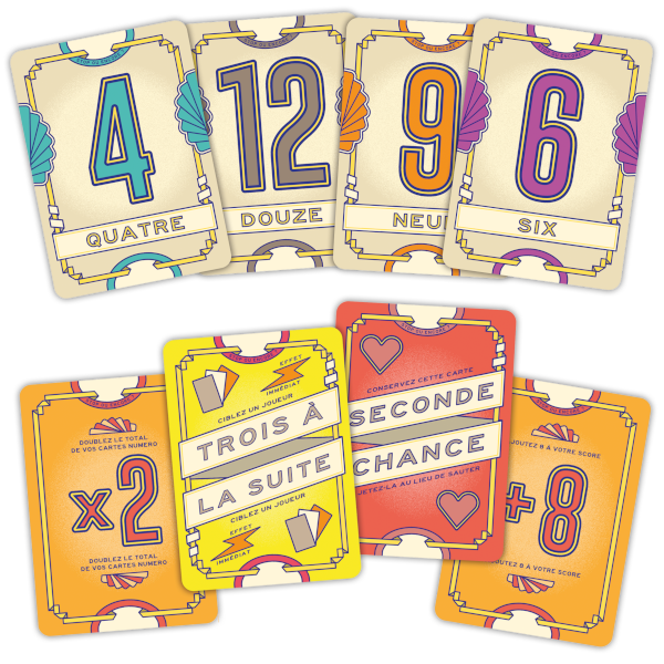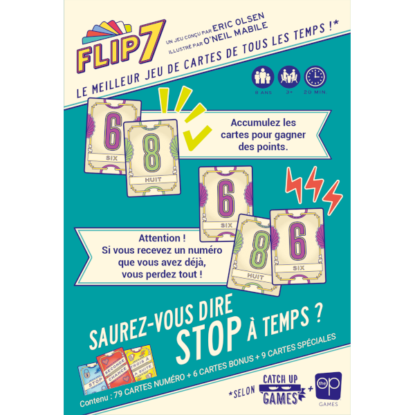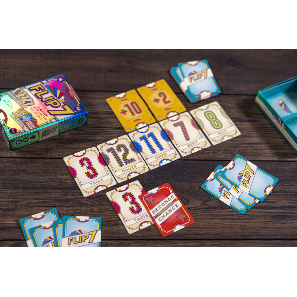 Des cartes spéciales peuvent également intervenir, offrant des avantages comme protéger vos points, bloquer vos adversaires ou les forcer à prendre plusieurs cartes à la fois. Si vous parvenez à collecter sept numéros différents, vous réalisez un "Flip 7", mettant fin à la manche et récoltant 15 points supplémentaires.