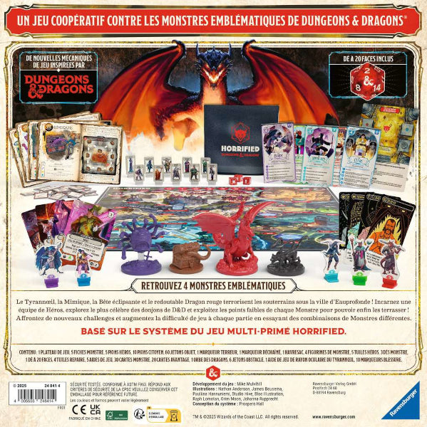 Horrified: Dungeons & Dragons est l'adaptation coopérative et accessible du célèbre JDR. De 1 à 5 joueurs, incarnez des héros aux compétences uniques, récupérez des objets et résolvez les énigmes pour vaincre des monstres emblématiques comme le Tyrannoeil avant que la Terreur n'envahisse Eauprofonde.