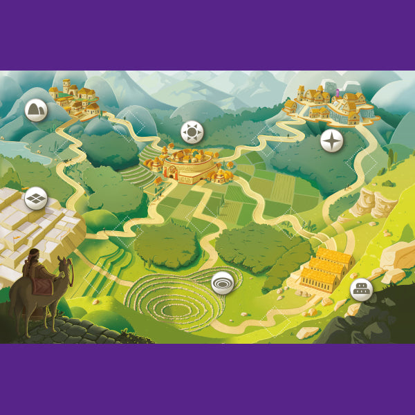 L’action se déroule à Cuzco en 1450 : crimes mystérieux, rites et rites sociaux forment un décor riche où il faut déterminer qui, où et quand. À chaque tour, associez un lieu à un personnage ou à un instant pour obtenir une information publique (ex. nombre de personnes présentes) et une information privée (ex. qui était présent). Prenez des notes, recoupez les indices et soyez le premier à annoncer la solution complète pour remporter la partie — mais attention : une mauvaise proposition vous élimine de la course.